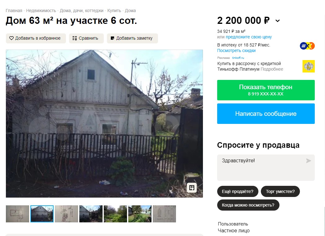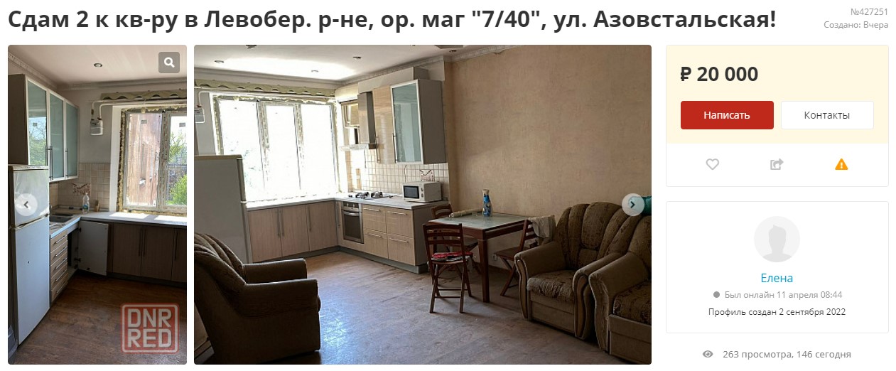 "Во время "СВО" дом практически не пострадал, ведется капитальный ремонт всего дома. Квартира не пострадала, только штукатурка осыпалась и т.п. Дом располагается в спальном районе. До моря 20-30 минут пешком. Школа и детский сад в 3 минутах ходьбы", — пишет собственник и просит 1,5 млн рублей (700 тысяч гривен).
