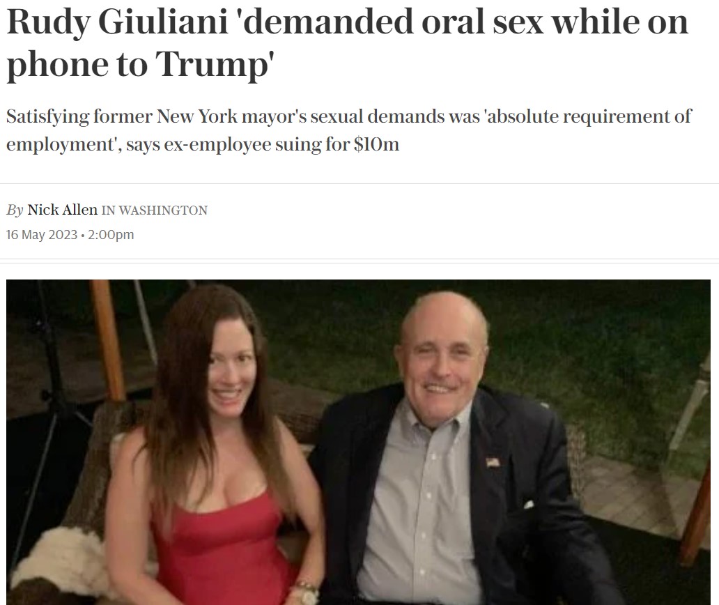 "Бывшая коллега подает в суд на Джулиани на 10 млн долларов, утверждая, что он подверг ее "широкомасштабному сексуальному насилию и домогательствам". В 70-страничной жалобе 43-летней Ноэль Данфи говорится: "Он часто требовал орального секса, когда говорил по громкой связи с высокопоставленными друзьями и клиентами, включая тогдашнего президента Трампа". Джулиани сказал Данфи, что ему нравится это занятие во время телефонных переговоров, потому что так он может "почувствовать себя Биллом Клинтоном". По ее словам, Джулиани "часто требовал, чтобы она работала голой, в бикини или мини-шортах с американским флагом, которые он ей купил".
