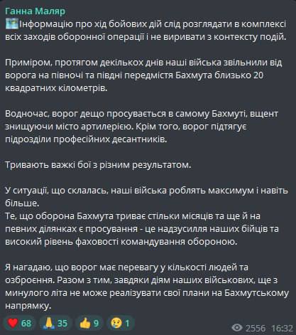 "Противник продвигается внутри самого Бахмута, и подтягивает туда профессиональных десантников. Продолжаются тяжелые бои с разным результатом", - сообщила Маляр.