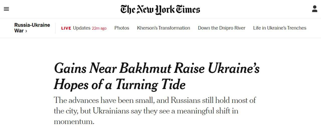 15.25 Успехи под Бахмутом укрепляют надежды Украины на переломный момент, пишет New York Times.