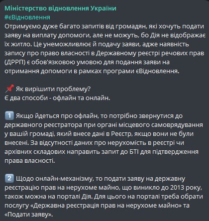 Украинцы жалуются в Минвосстановления, что не могут подать заявку на восстановления жилья, т.к. в "Дие" их жилье не отображается.