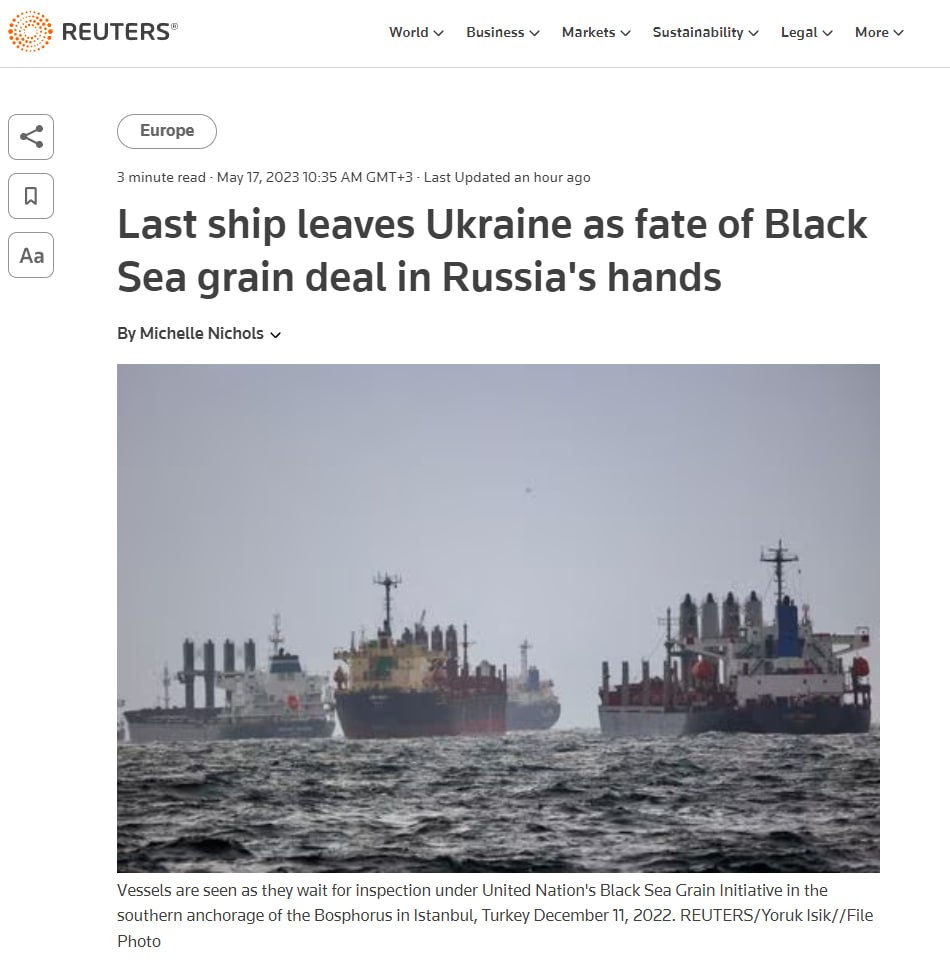 Предварительные договоренности по работе "зернового коридора" действуют до 18 мая.