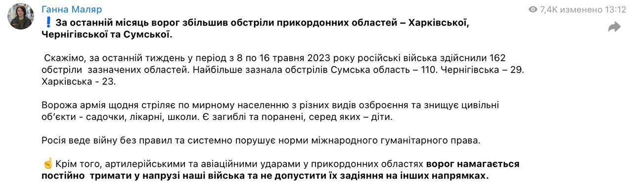 "Артиллерийскими и авиационными ударами в приграничных областях враг пытается постоянно держать в напряжении наши войска и не допустить их задействования по другим направлениям", - пишет Маляр.
