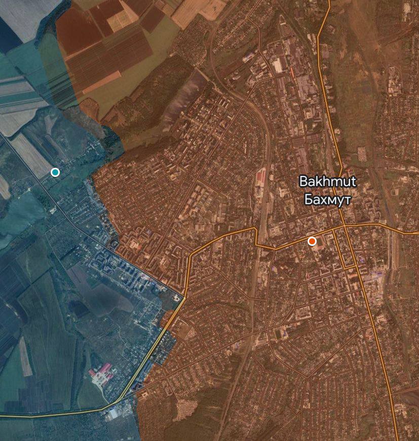 Куратор "Вагнера" Пригожин со вчерашнего дня заявляет, что захвачен многоэтажный микрорайон "Гнездо" на западе Бахмута, за который бои шли в последние несколько дней. А также ряд других укрепрайонов ВСУ в городе. По его данным, бои переместились в нижнюю часть улицы Юбилейной и конец улицы Чайковского. До полного захвата Бахмута остались, по заявлениям Пригожина, "считанные дома".