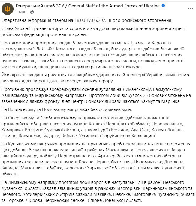 Война в Украине продолжается уже 448-й день. Мы следим за новостями 17 мая в своем онлайне.