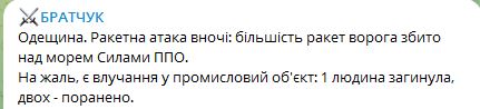 "Ракетная атака ночью: большинство ракет врага сбито над морем Силами ПВО. К сожалению, есть попадание в промышленный объект: один человек погиб, двое ранены", - сообщил он.