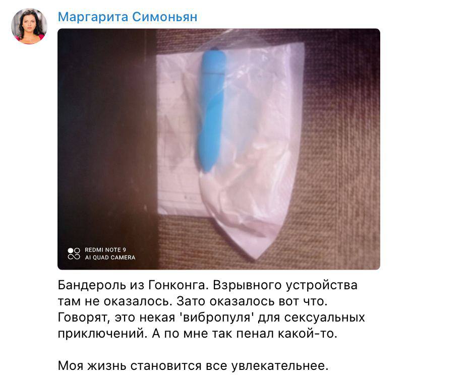 Позже Симоньян написала, что взрывчатки в бандероле не оказалось. Там была "вибропуля для сексуальных приключений".