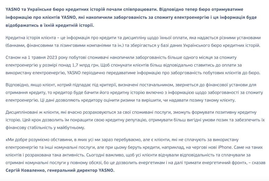 По состоянию на 1 мая бытовые потребители накопили задолженность более одного месяца за потребленную электроэнергию в размере более 1,7 млрд грн. Чтобы побудить клиентов более ответственно относиться к оплате за использованную электроэнергию, YASNO будет периодически передавать информацию о задолженности бытовых клиентов в Украинское бюро кредитных историй.