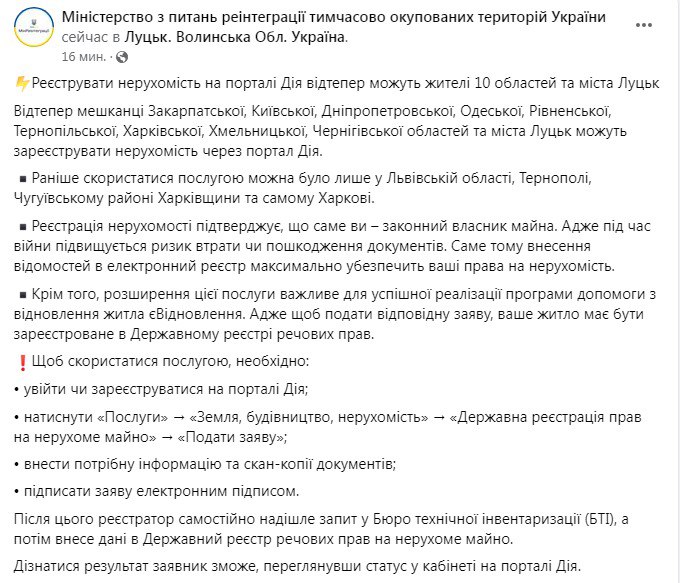 Регистрировать недвижимость на портале "Дия" теперь могут жители 10 областей и Луцка. В частности, в Закарпатской, Киевской, Днепропетровской, Одесской, Ровенской, Тернопольской, Харьковской, Хмельницкой и Черниговской областях.
