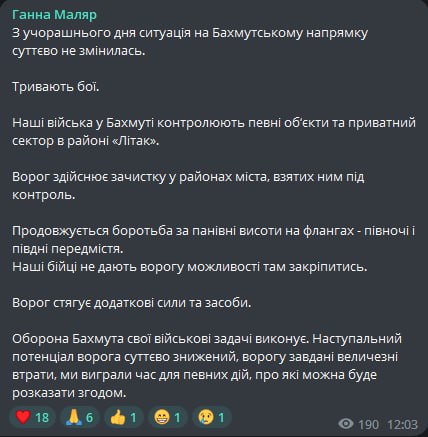 Идет борьба "за определенные высоты на флангах" на севере и юге от Бахмута. "Противник стягивает дополнительные силы и средства", - сообщила Маляр.