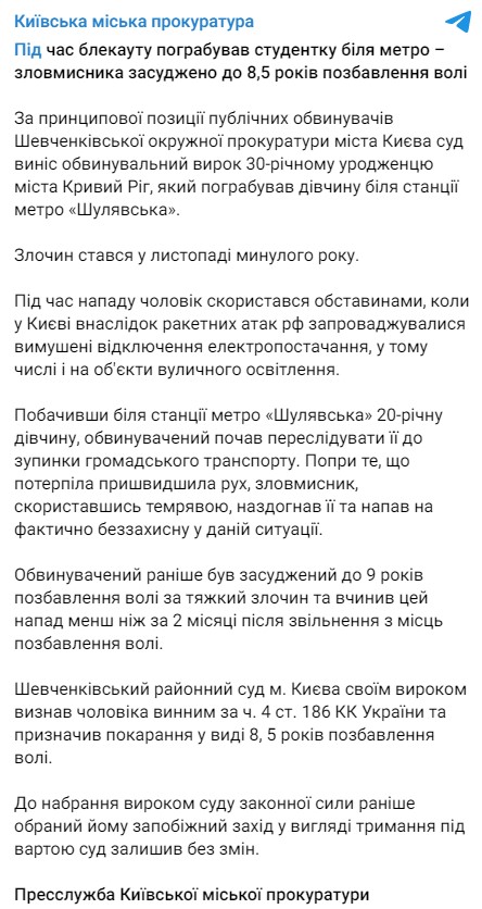 В Киеве во время блэкаута 30-летний уроженец Кривого Рога ограбил студентку. Суд признал мужчину виновным и приговорил к 8,5 годам лишения свободы.