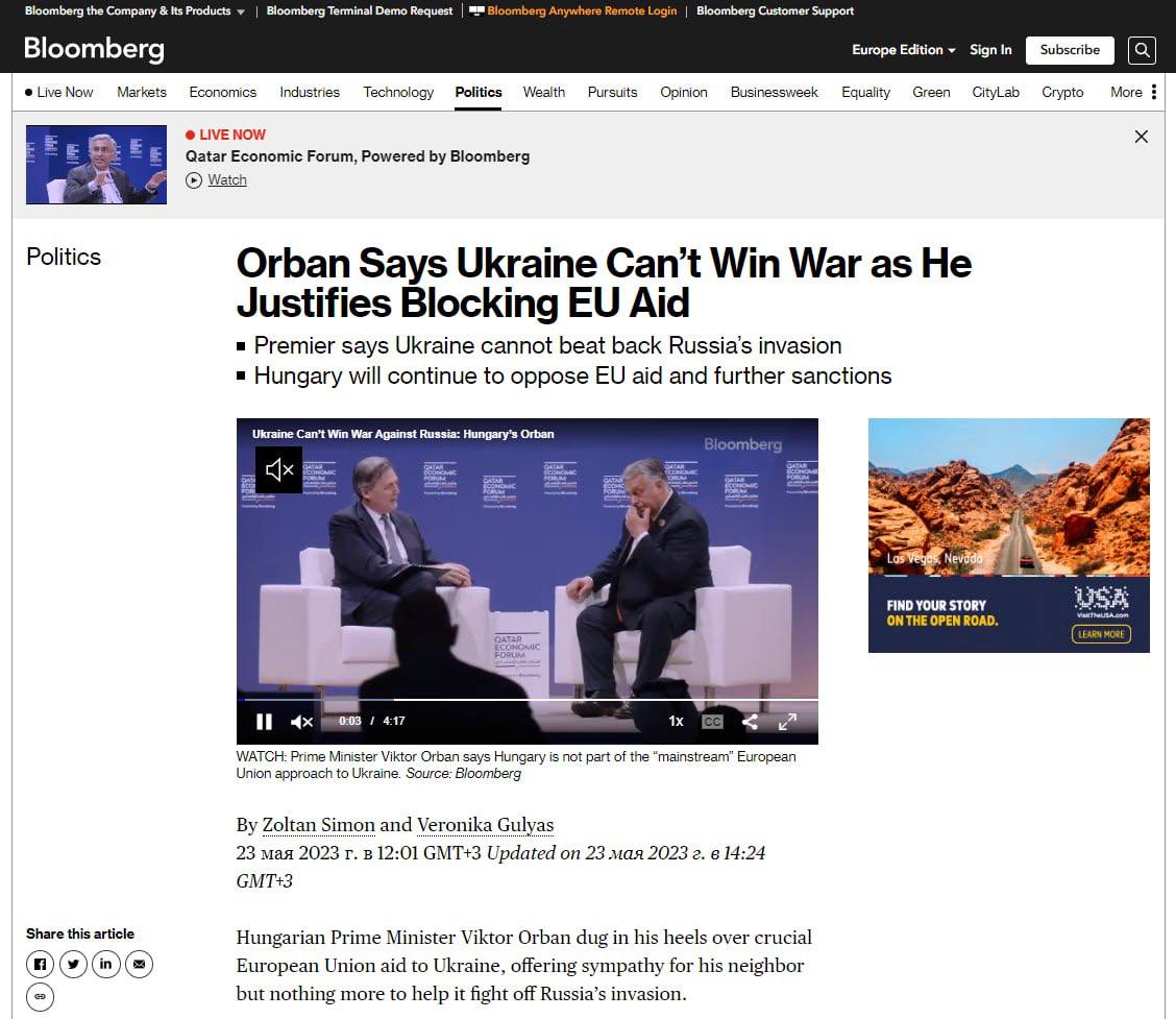 На уточняющий вопрос, действительно ли он считает, что Украина не способна выиграть войну, Орбан ответил утвердительно.