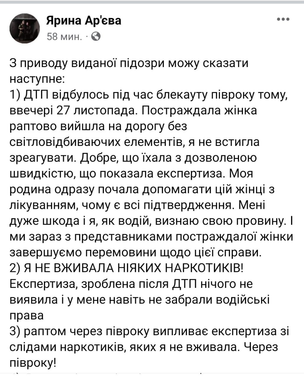 "ДТП произошло во время блэкаута полгода назад вечером 27 ноября. Пострадавшая женщина внезапно вышла на дорогу без световозвращающих элементов, я не успела среагировать. Хорошо, что ехала с разрешенной скоростью, что показала экспертиза. Моя семья сразу начала помогать этой женщине с лечением, чему все подтверждения. Мне очень жаль и я, как водитель, признаю свою вину. И мы сейчас с представителями пострадавшей женщины завершаем переговоры по этому делу", - заявила Арьева.