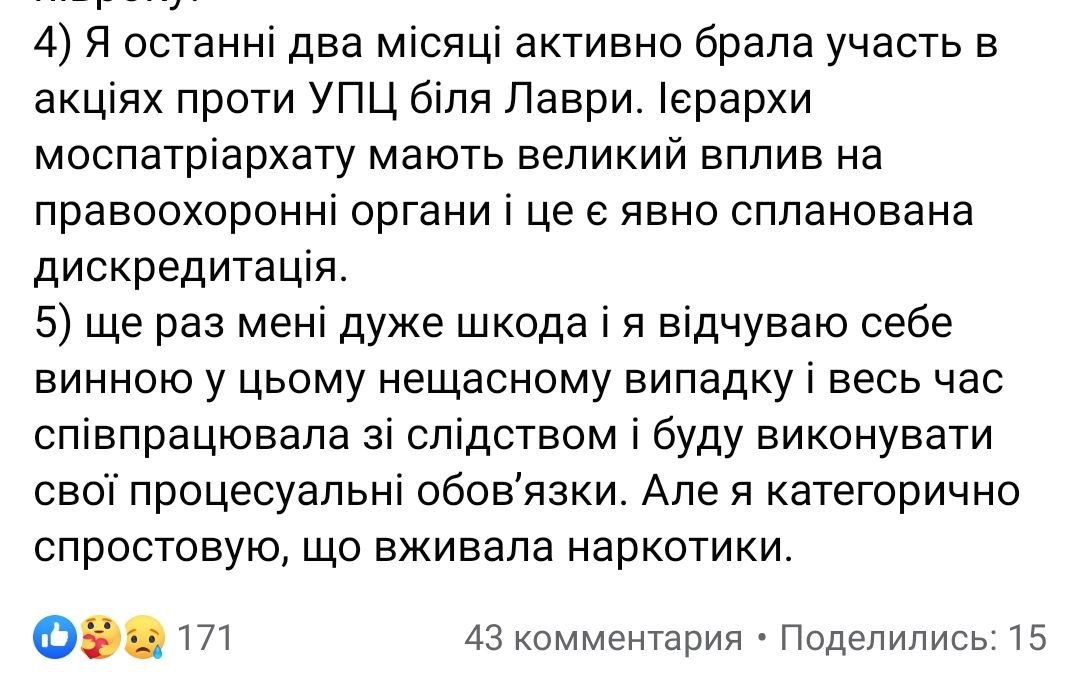 Арьева считает подозрение "спланированной дискредитацией" и связывает ее со своим участием в акциях против УПЦ под Киевской Лаврой.