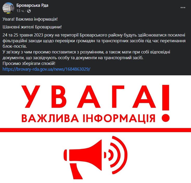 Также усиленные фильтрационные мероприятия ожидаются в Броварском районе 25 мая.