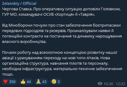 "Начали работу над комплексной концепцией развития нашей авиации с учетом перехода на новые типы самолетов. Новая организационная структура, обучение пилотов и персонала, необходимая инфраструктура, материально-техническое обеспечение и т.д.", - сообщил Зеленский.