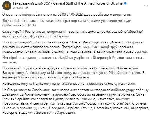 В среду, 24 мая, в Украине продолжается уже 455-й день войны с Россией.