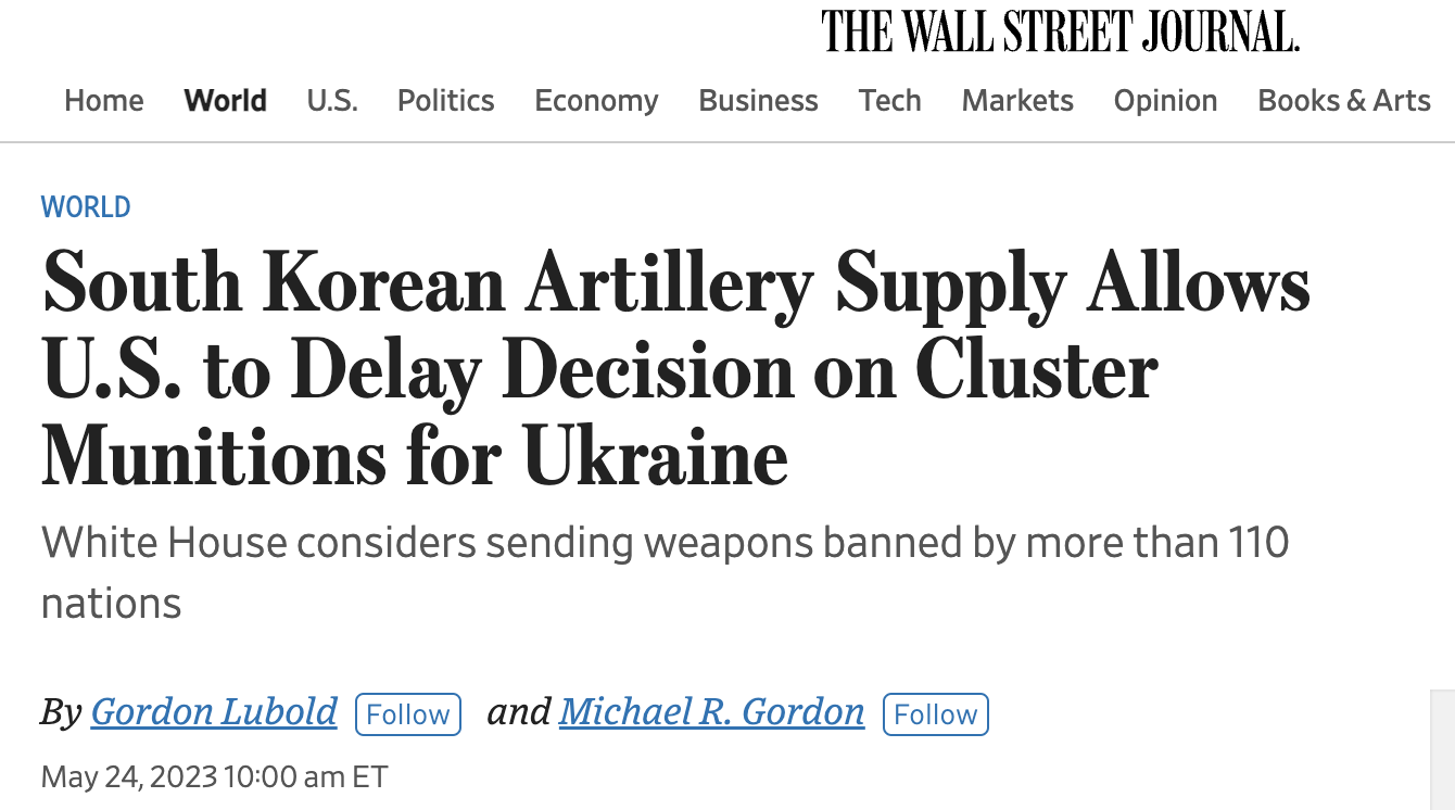 "Южная Корея продолжает передачу сотен тысяч артиллерийских снарядов для Украины – шаг, который, по словам американских официальных лиц, сделает запланированное Киевом наступление против российских войск эффективным и позволит Белому дому отложить принятие решения о поставках кассетных боеприпасов, запрещенных многими странами", - говорится в материале.