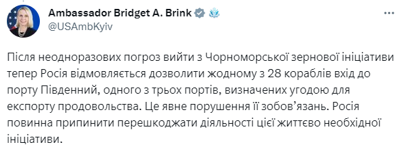 "После угроз выйти из Черноморской зерновой инициативы, Россия теперь отказывается разрешить доступ любому из 28 кораблей в порт Южный, который был одним из трех портов, определенных для экспорта продовольствия. Это явное нарушение их обязательств. Россия должна прекратить препятствовать этой жизненно важной инициативе", - написала Бринк.