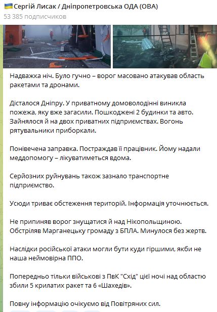 Ночью россияне совершили массированную атаку по Днепропетровской области ракетами и дронами.