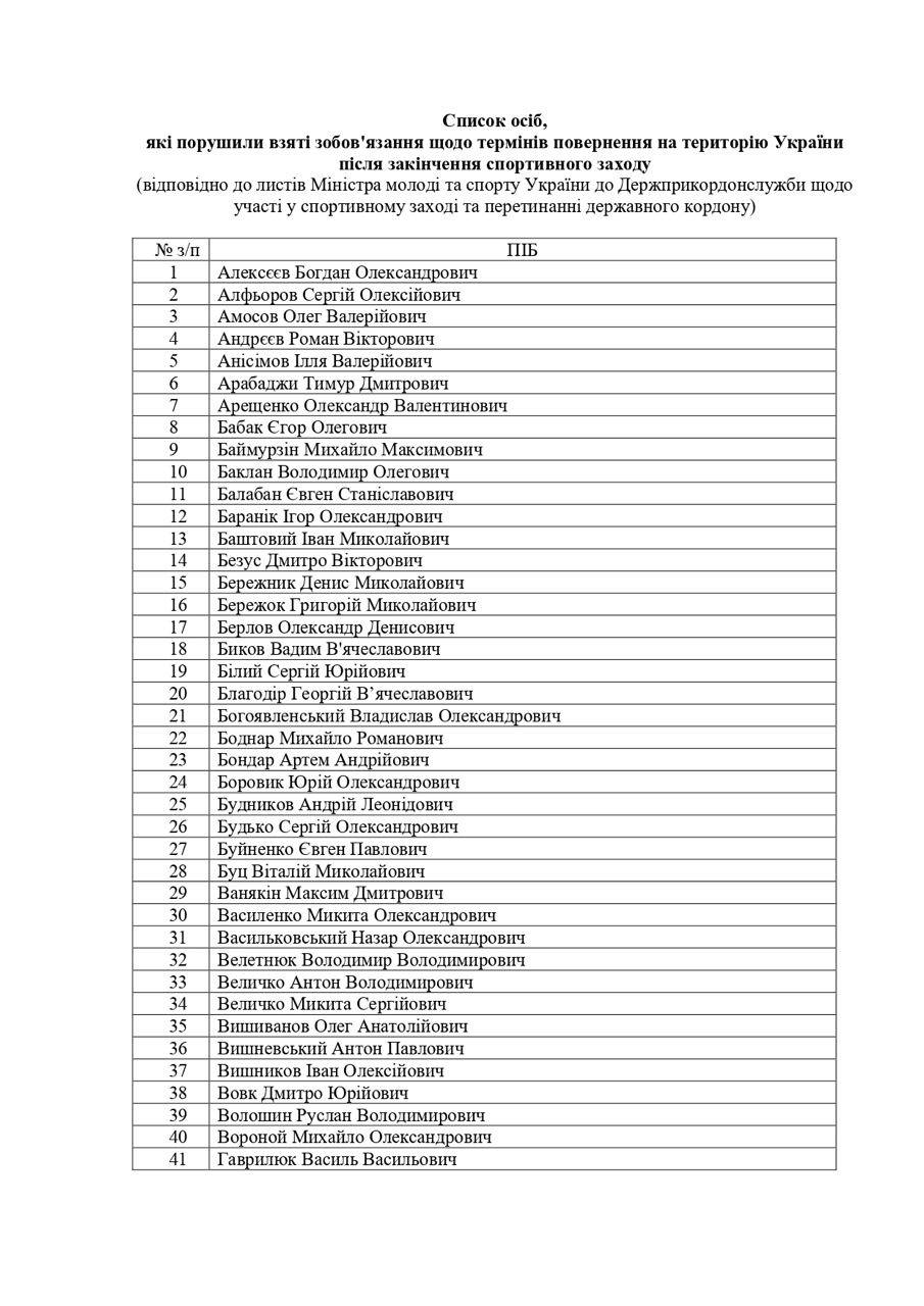 Министерство спорта публикует список из 236 спортсменов, которые не вернулись из-за границы. Разрешение на выезд им было выдано на время проведения спортивных мероприятий, но вовремя в Украину они не вернулись.