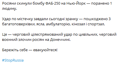 Последствия обстрела Нью-Йорка. Фото Донецкой ОГА