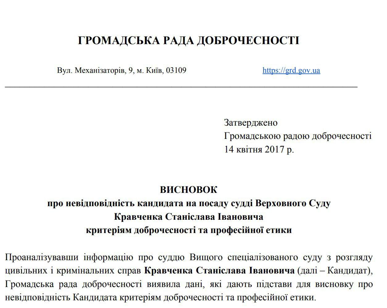 Накануне назначения в Кассационный уголовный суд в 2017 году по поводу Кравченко возникли претензии у Общественного совета добропорядочности: там утверждали, что в своих декларациях он не указал участок земли на 900 квадратных метров, которым де-факто владел с 2002 года. Участок находится в городе Козелец Черниговской области.