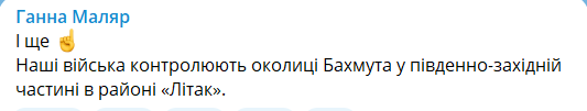 12: 10 После заявления Юрия Луценко о том, что россияне уже полностью захватили Бахмут, заместитель министра обороны Украины Анна Маляр вновь сказала, что в городе ВСУ все ещё контролирует юго-западную часть в районе разрушенного памятника самолёту (напомним, россияне заявляют, что захватили его ещё неделю назад).
