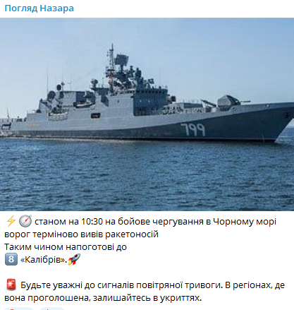 "По состоянию на 10:30, на боевое дежурство в Черном море враг срочно вывел ракетоноситель. Таким образом, наготове до 8 "Калибров", - пишет Назаров.