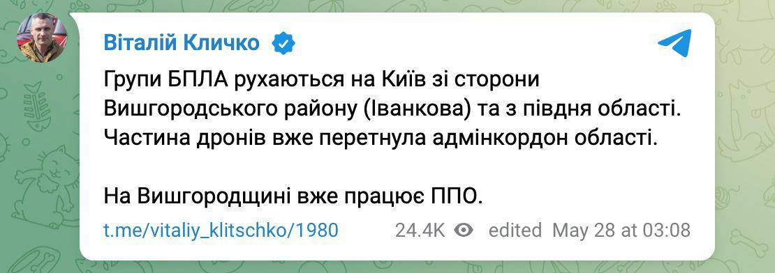 03: 13 Виталий Кличко: "группы БПЛА двигаются в Киев со стороны Вышгородского района и с юга области. Часть дронов уже пересекла админграницу области. В Вышгородской районе уже работает ПВО. Оставайтесь в укрытиях!".