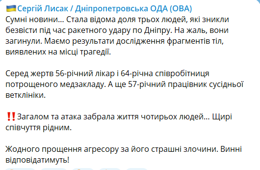 Трое человек, пропавшие без вести после ракетного удара по медучреждению Днепра, погибли. Об этом сообщил губернатор области Сергей Лысак.