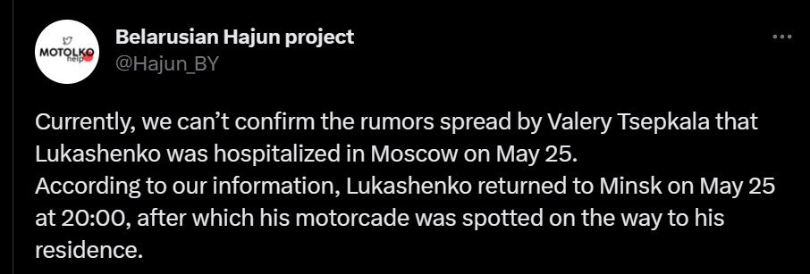 "По нашей информации, Лукашенко вернулся в Минск 25 мая в 20:20, после чего его кортеж был замечен на пути к резиденции", - заявил мониторинговый телеграм-канал "Беларускі Гаюн".