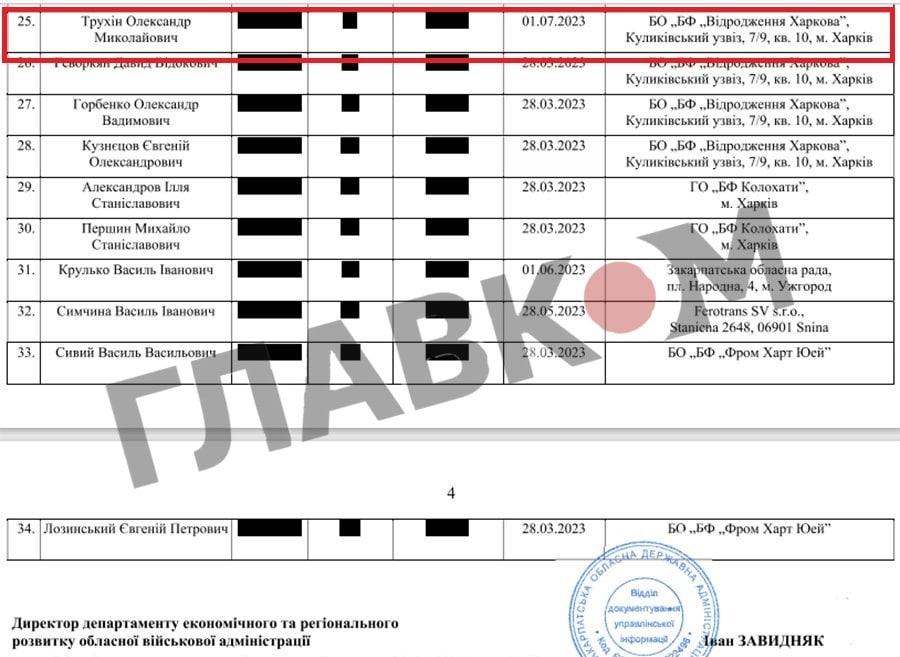 Официально в водители Трухина направил благотворительный фонд "Возрождение Харькова". Организация появилась в марте 2022 года. Учредителями выступили пятеро жителей Харькова. С марта 2023 фонд прописан в Хусте Закарпатской области.