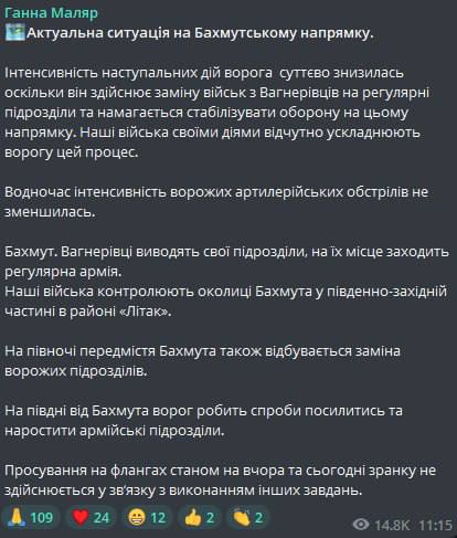 "Бахмут. "Вагнеровцы" выводят свои подразделения, на их место заходит регулярная армия. На севере пригорода Бахмута также происходит замена вражеских подразделений. К югу от Бахмута враг делает попытки усилиться и нарастить армейские подразделения", - написала она.