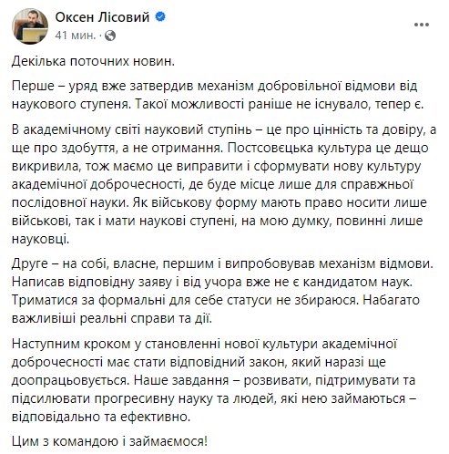 Министр образования Украины Оксен Лисовой отказался от научной степени после обвинений в плагиате диссертации и ее проверки. Он сообщил, что стал первым украинцем, который отказался от степени кандидата наук после того, как 19 мая правительство утвердило механизм такого отказа.
