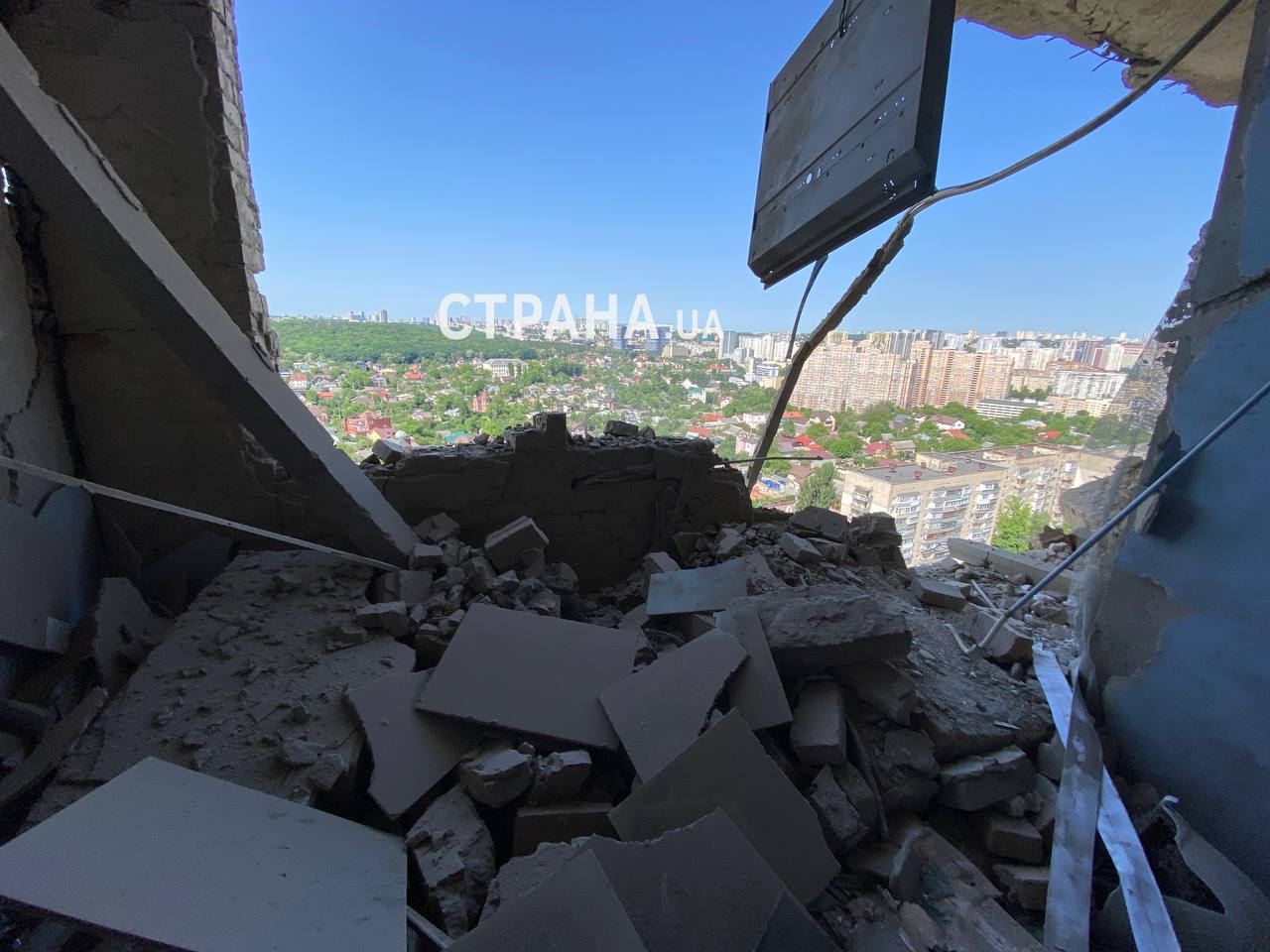 Появились кадры с разрушенных этажей многоэтажки в Голосеевском районе Киева, на которую упали обломки российского дрона.