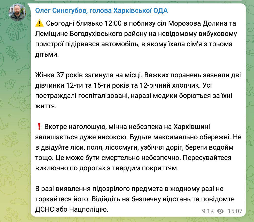 "Сегодня около 12:00 вблизи деревень Морозова Долина и Лемищино Богодуховского района на неизвестном взрывном устройстве взорвался автомобиль, в котором ехала семья с тремя детьми. Женщина 37 лет скончалась на месте. Тяжелые ранения получили две девочки 12 и 15 лет и 12-летний мальчик. Все пострадавшие госпитализированы, медики борются за их жизнь", - сказано в посте.