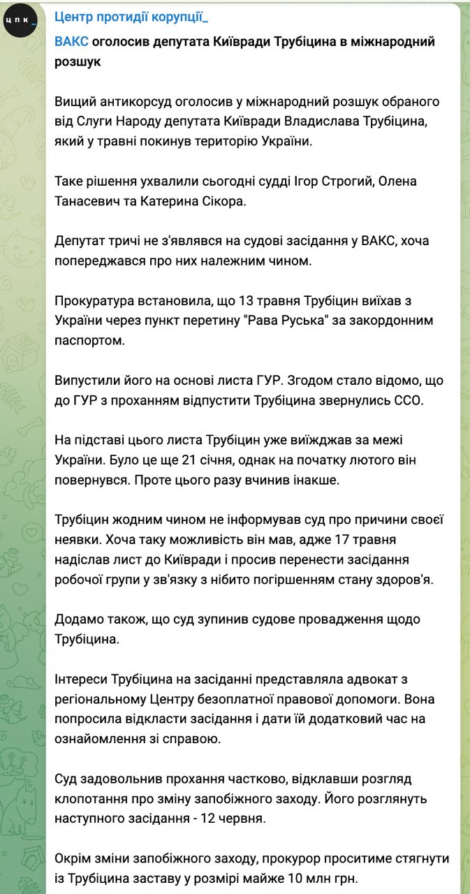 Высший антикоррупционный суд (ВАКС) объявил в международный розыск подозреваемого в коррупции депутата Киевсовета Владислава Трубицына ("Слуга народа"), выехавшего за границу благодаря письму из ГУР.