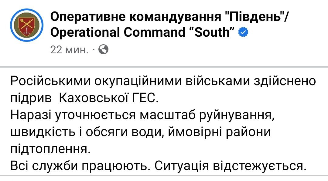 Во вторник, 5 июня, стало известно, что россияне взорвали Каховскую ГЭС.
