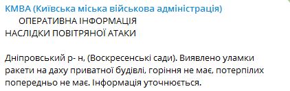 Также в КГВА сообщили, что в Днепровском районе (Воскресенские сады) обломки ракеты обнаружены на крыше частного строения. Возгорание не последовало, потерпевших не было.