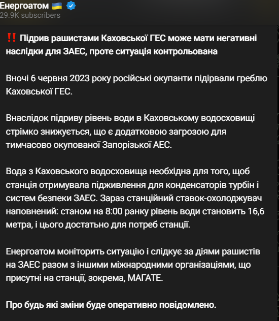 В "Энергоатоме" заявили, что подрыв Каховской ГЭС может иметь негативные последствия для ЗАЭС