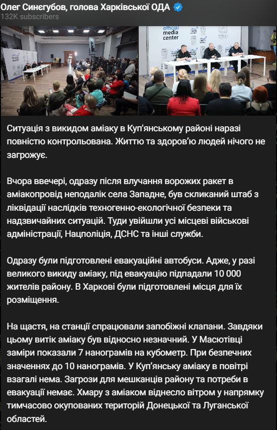 "Благодаря этому утечка аммиака была относительно незначительной. В Масютовке замеры показали 7 нанограмм на кубометр. При безопасных значениях до 10 нанограмм. В Купянске аммиака в воздухе вообще нет. Угрозы жителям района и потребности в эвакуации нет. Облако с аммиаком унесло ветром в направлении временно оккупированных территорий Донецкой и Луганской областей", - сообщает Синегубов.