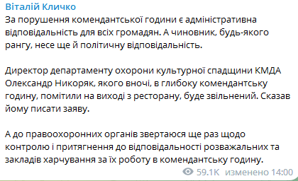"Директор департамента охраны культурного наследия КГГА Александр Никоряк, которого ночью, в глубокий комендантский час, заметили на выходе из ресторана, будет уволен. Сказал ему писать заявление", - сообщил мэр.