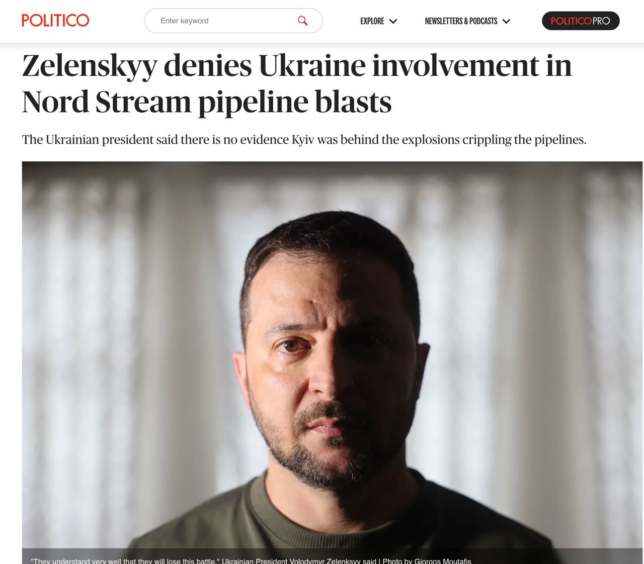 09.40 "Зеленский отрицает отношение Украины к подрыву "Северных потоков", - пишет в заголовке издание Politico, цитируя интервью украинского президента.
