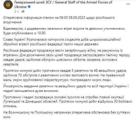В пятницу, 9 июня, Генштаб ВСУ обнародовал сводку о ситуации на фронте.