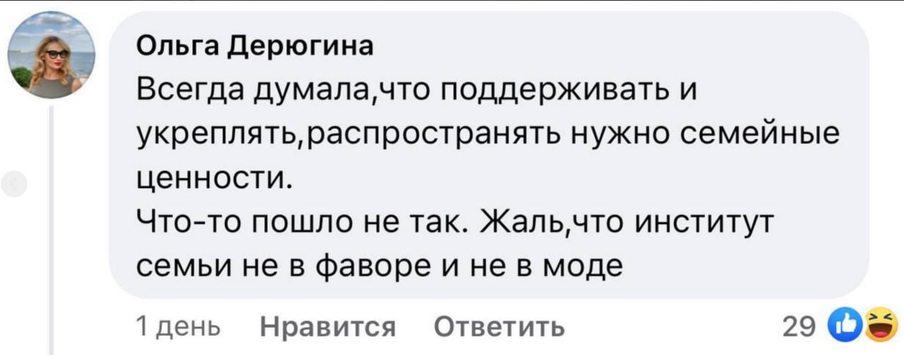 "Всегда думала,что поддерживать и укреплять, распространять нужно семейные ценности. Что-то пошло не так. Жаль,что институт семьи не в фаворе и не в моде" - говориться в одном из комментариев.