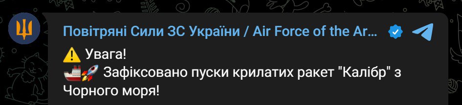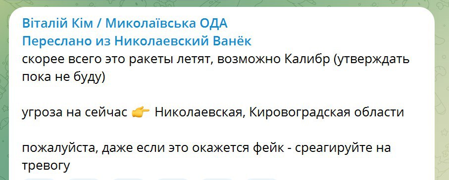 10.55 Губернатор Николаевской области Ким опубликовал сообщение о возможной атаке "Калибров" по Украине.
