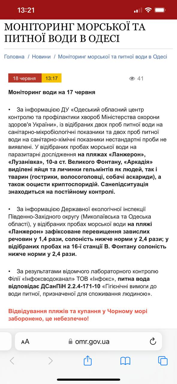 По информации Государственной экологической инспекции Юго-Западного округа, в отобранных пробах морской воды на пляже "Ланжерон" зафиксировано превышение взвешенных веществ в 1,4 раза, соленость ниже нормы в 2,4 раза. В отобранных пробах на 16 станции Большого Фонтана соленость ниже нормы в 2,4 раза.
