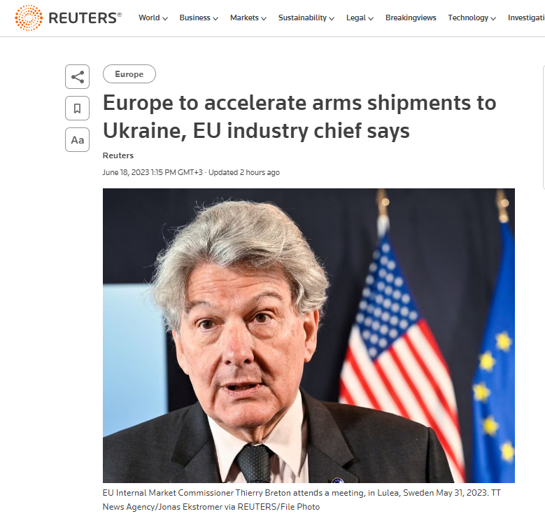 Евросоюз ускорит поставки оружия Украине для поддержки контрнаступления - еврокомиссар