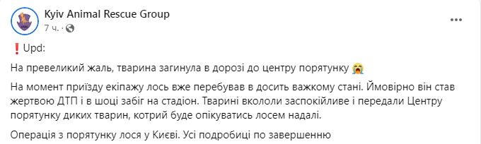 Для осмотра животного выехал экипаж волонтеров, к моменту его приезда лось уже был в довольно тяжелом состоянии. Вероятно, он стал жертвой ДТП и в шоке забежал на стадион. Копытному укололи успокоительное и передали Центру спасения диких животных, сотрудники которого намеревались лечить его.